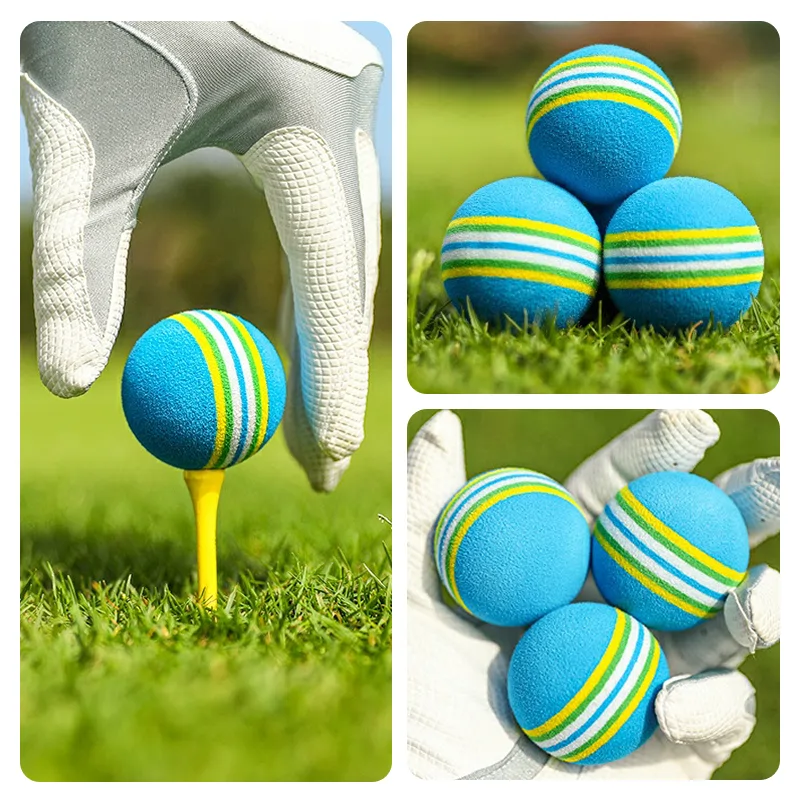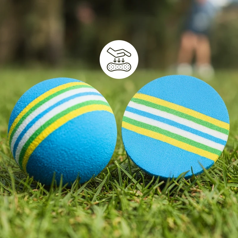I can work on my golf swing indoors without making noise or damage. The bright stripes are perfect for finding them in the backyard after practice.