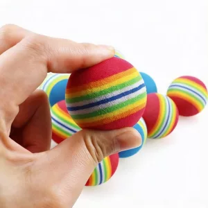 The colors are my favorite part. They’re bright, so we don’t lose any if they roll under bushes. Soft enough for indoor whacking too.