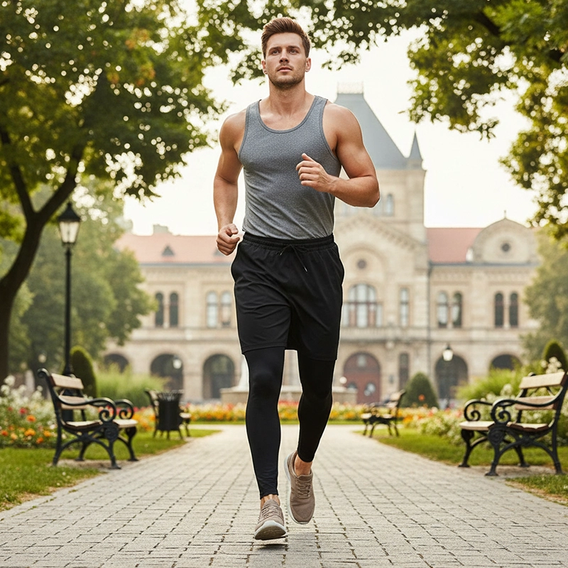 These shorts with the built-in leggings are my new gym fave. Easy to move in, and they dry fast after I sweat. No issues even during sprints.