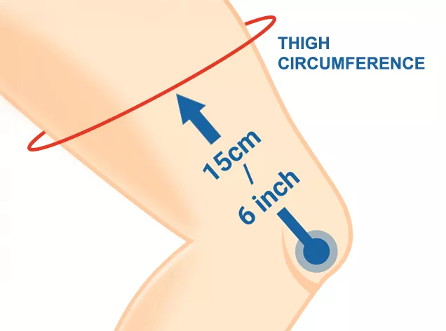 - 2. Wrap the measuring tape around the widest part of your thigh from about 15cm/6" above the midpoint of your kneecap.