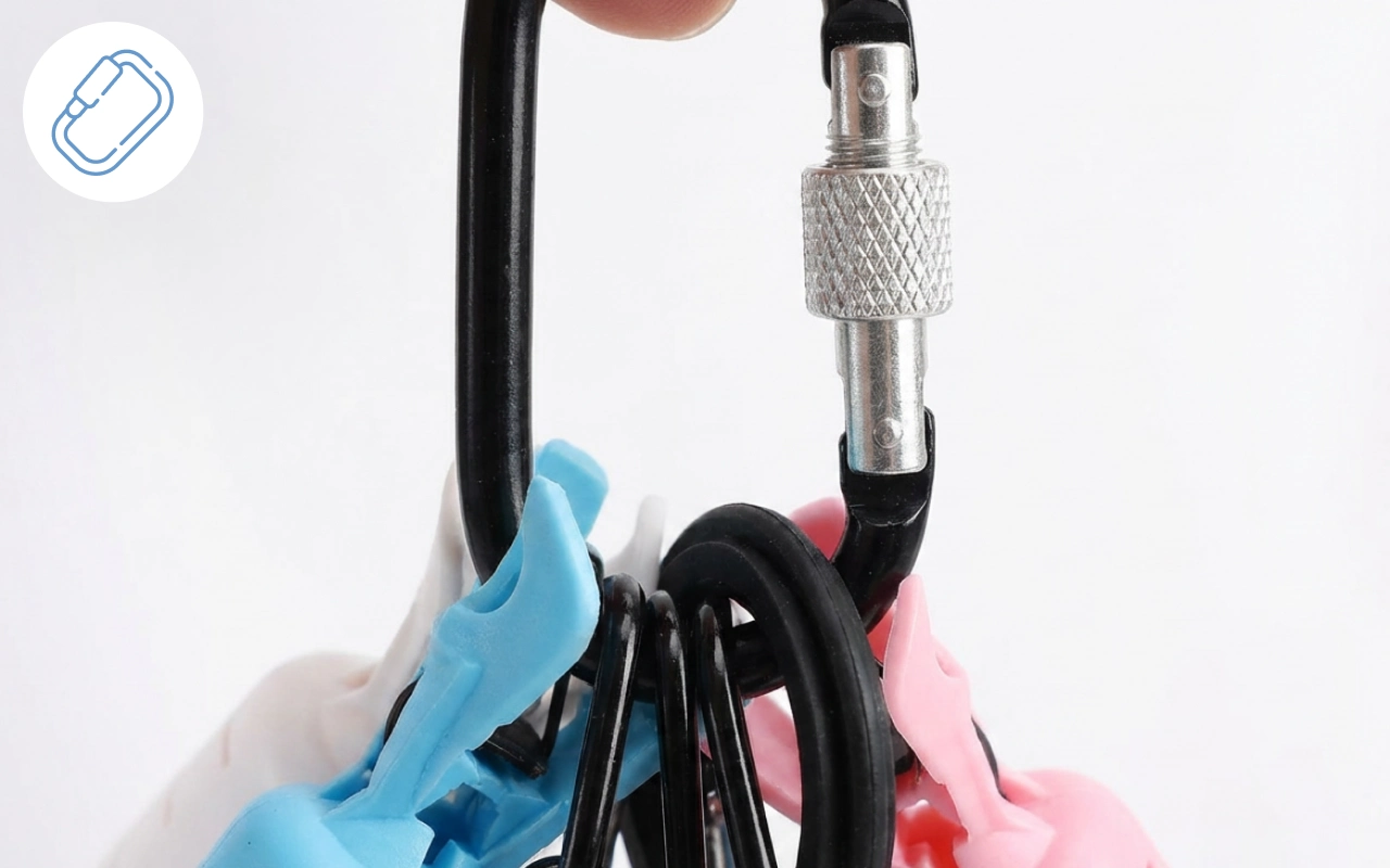 I clip all six covers to the carabiner and hang them on my tackle bag. They snap over the hooks fast and keep everything from tangling together.