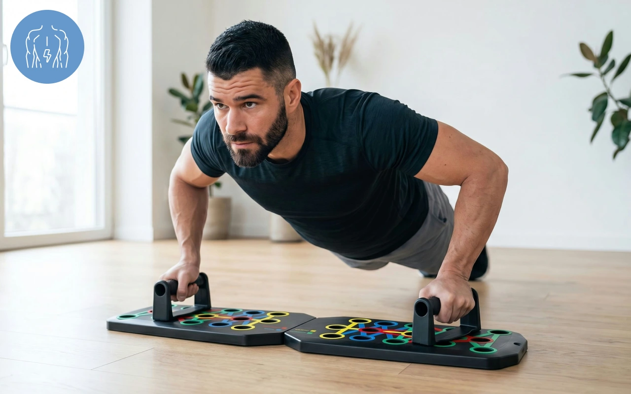 I live in a tiny apartment, so this board is a life saver. Folds flat under my bed and still gives a real gym-style push-up routine.