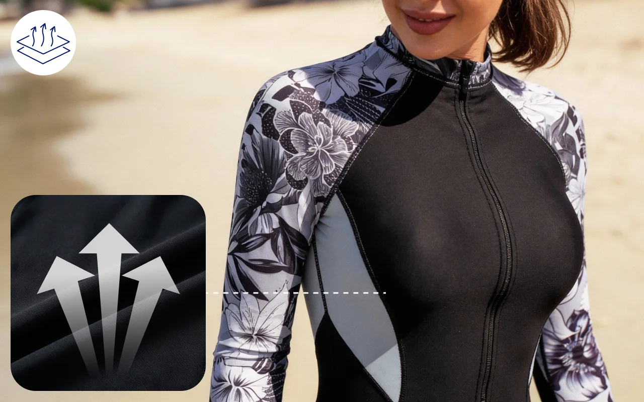 Material dries fast after each swim or dive session. You get back to relaxing or playing without feeling cold or weighed down.