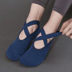 Threo Yoga Socks are workout socks designed for women practicing yoga, pilates, barre, ballet, and dance. Non-slip straps and grips enhance stability during exercise, and one size fits all fitness enthusiasts. Enjoy hygiene, comfort, support, and traction barefoot.