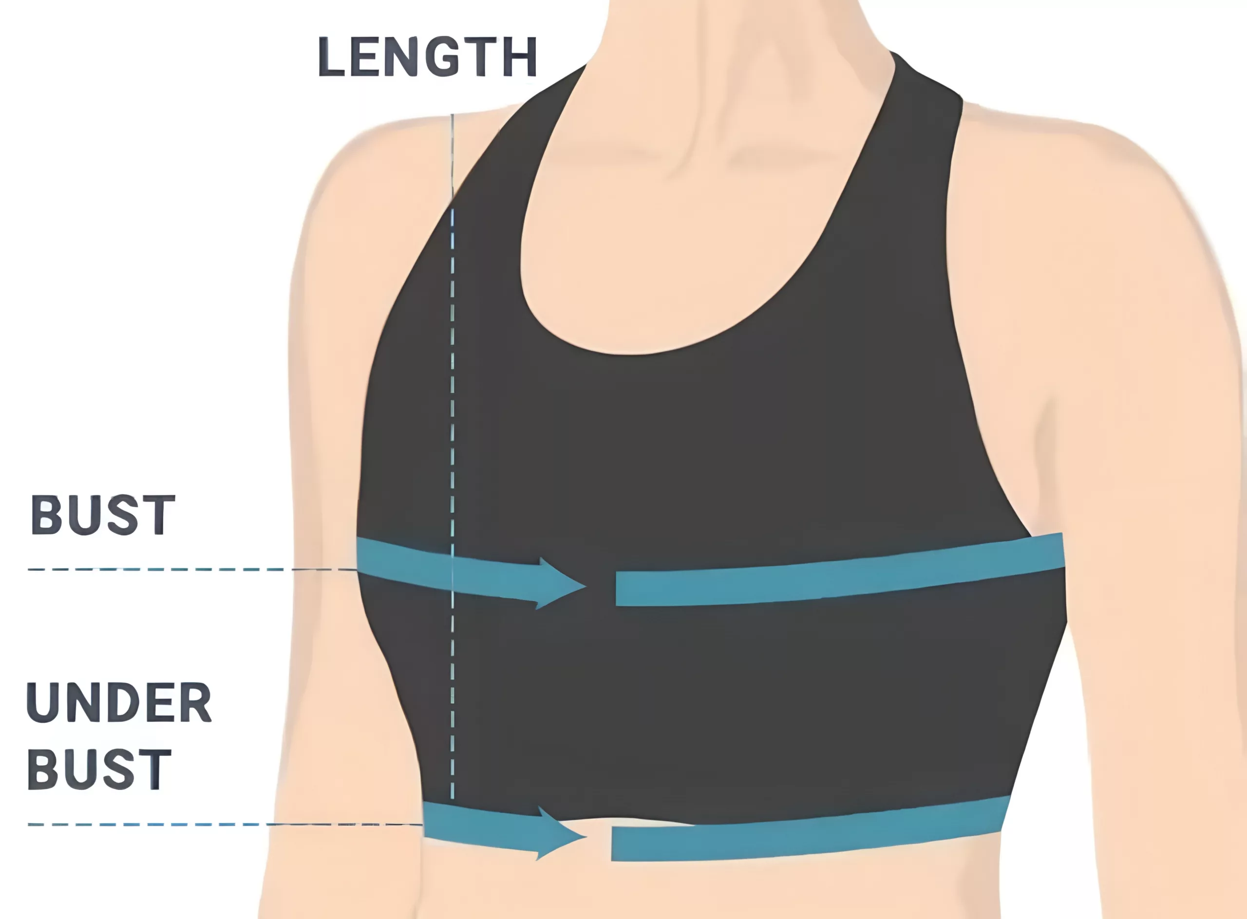 - 4. Start the measuring tape at your shoulder and extend it down to the underbust line.