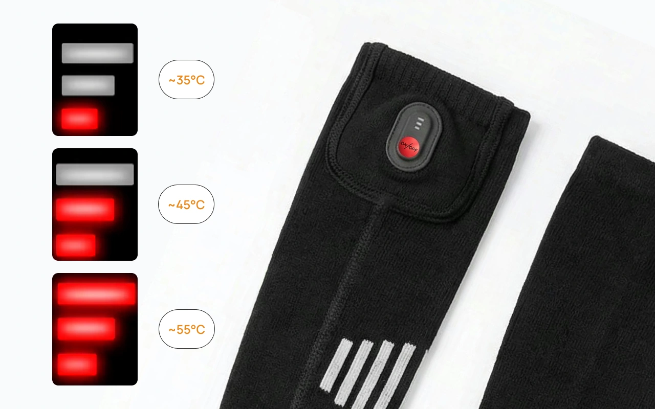 I wear these on long winter hikes. The three heat levels help a lot when the weather shifts, and I like that my feet never feel sweaty or damp.