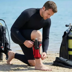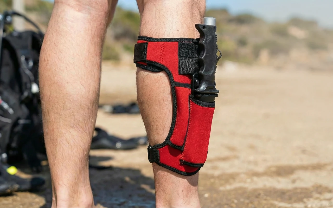 Length adapts to fit both thigh and calf snugly. D‑ring helps lift and secure, adding confidence every dive.