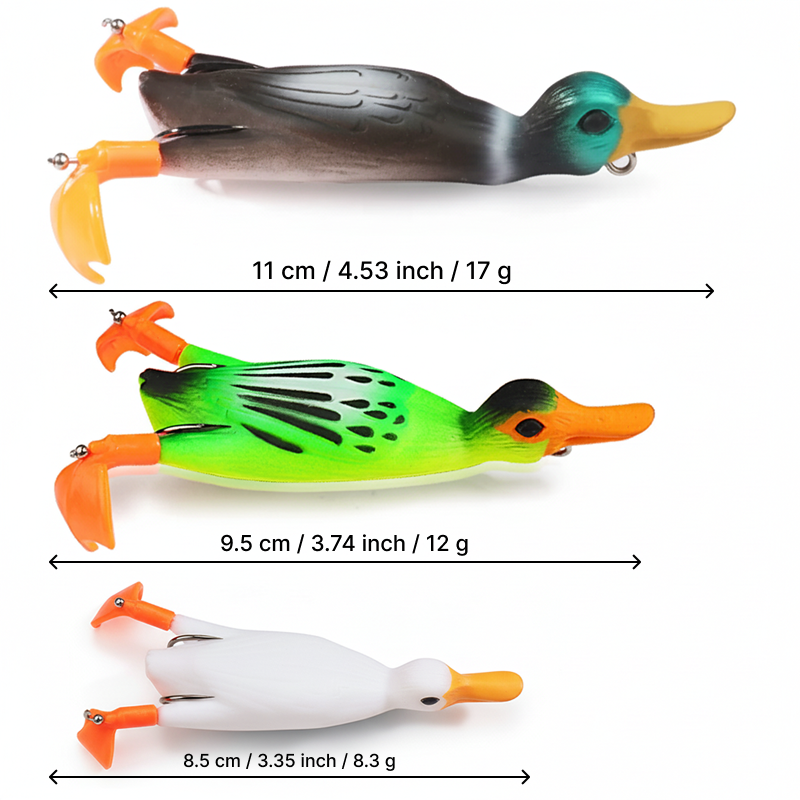 Tried other lures, but this soft duck worked much better. Fish bite fast and get hooked quick. Spinning feet action attracts even lazy ones.